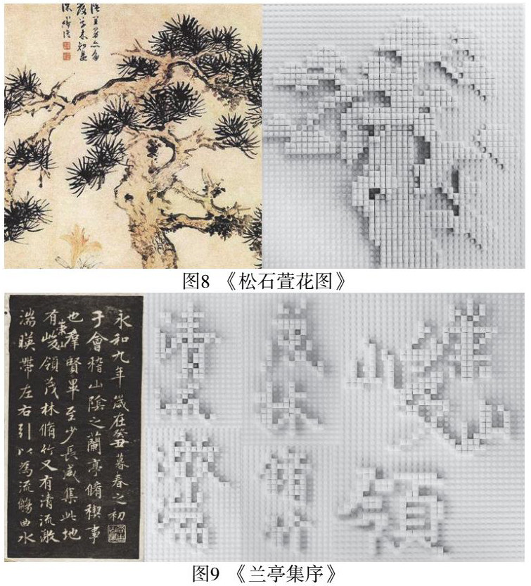 乐高是一种现代的塑胶积木玩具,这种塑胶积木一头有凸粒,另一头有可嵌入凸粒的孔,它可以随意创作、拼插出变化无穷的造型。我的主题为《游戏与文化》的设计作品,其中的“游戏”就是指乐高游戏,“文化”就是指中国传统文化中的中国画艺术。我创作前期是利用乐高玩具的可塑造性的特点,以中国古代名画中,黄公望的《富春山居图》(图5)中的山的造型、八大山人画的石的造型(图6)、马远《十二水图》(图7)中水波纹的造型、陈淳的《松石萱花图》(图8)中松树的造型以及王羲之的《兰亭集序》(图9)手稿中文字的造型等等元素为原型,使用单一的白色乐高积木和背景板,将原作中的中国画元素和中国画元素的笔触利用积木层次的叠加来模仿和概括,表现出原作中笔触的浓、淡、虚、实等视觉语言。这是一次中国画元素载体的创新。