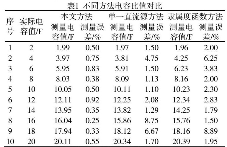 智能配电网中的参数测定与智能仪器功能实现具有关,智能仪器测量精度与智能配电网运行状态高度相关。用大小相同的电容模拟智能配电网线路对地电容,将自动跟踪补偿装置与对地电容同时接入仿真线路。本文方法所用自动跟踪补偿装置消弧结构获取电容值结果如表1所示,为直观展示本文方法检测精准性,将本文方法与单一直流源方法[6]和隶属度函数方法[7]对比。