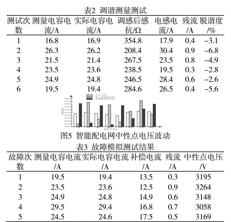 表3实验结果可以看出,智能配电网出现接地故障时,自动跟踪补偿装置消弧结构可实现接地电阻的短接,明确造成智能配电网故障的电感电流、电容电流、中性点电压以及故障残流等各项参数。本文方法补偿后,智能配电网残流均小于1A,自动跟踪补偿装置消弧结构将接地电阻投入,并将故障残余有效存储,再次测量消除故障后电抗器调感以及电容电流。