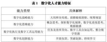 具体而言,数字化人才的能力特征如下:一是要具有数字化战略能力,就是指要具备数字化大局观,能够洞悉事物现象背后隐藏的深层次含义,对商业机会具有前瞻敏锐洞察力,具有全局统筹规划能力。二是要具有数字化思维能力,就是指在不确定情况下能够形成概念或框架,能够洞悉复杂系统中蕴含的普遍性数字规律,善于用数字思维发现事物之间的联系,能够把握好企业数字化路径,并会利用数字规律进行辅助决策。三是数字化执行及数字工具运用能力,就是指能够以任务完成及效率为导向,通过整合包括数字资源在内的各种资源,自如运用数字化工具灵活分析及科学处理各种事务。四是数字化创新能力,就是指要具有广阔视野,宽阔胸怀和开放眼光,善于吸收数字性知识数和字化方法,敢于突破和变革。数字化人才能力特征具体如表1所示。