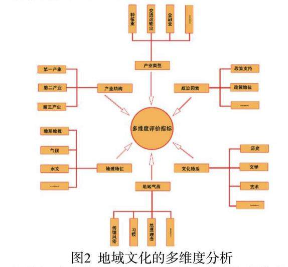 地域文化是地区独特性和多元性的深度体现,也是某一地区区别于其他地区的形象展示。不同地域文化孕育出的产业园区在产业特色、生产领域、产业模式等方面会呈现出截然不同的差异性,这也为标志设计在创作上提供启发性的思路和借鉴。在进行产业园区标志设计前,我们可用多维度的评价指标来对具体的产业园区进行分析(见图二):