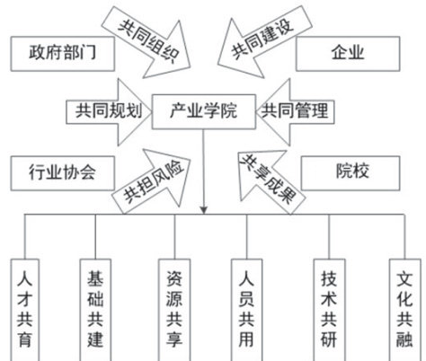 (1)面向产业学院—校企合作产教融合的深度产物,以高等教育为研究对象。研究为满足区域经济发展,通过社会多主体深度结合,院校与政府、企业三方扮演不同角色承担不同权、责的深层次、立体化、全方位的办学组织,进行各方共享资源,相互协作,科学研究、成果转化、创新创业为一体的推进产、学、研、转、用深度融合的新型办学形式来进行未来人才培养的模式研究。
