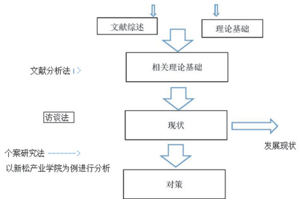 研究包括五部分。第一部分是提出问题,阐述课题的研究背景及研究意义,对国内外关于高校产业学院育人模式的研究成果进行评述,并指出本文的主要研究内容、关键问题、研究方法、论文的基本构成及技术路线;第二部分是理论基础研究,对与本研究相关的技术创新和创新平台理论、产学研合作理论、机制理论及其他相关理论方法进行了研究;第三部分是分析问题,主要内容包括:运用相关理论,解释高校产业学院平台的概念,分析平台的构成,建立平台的构成机理模型;分析平台运行的影响因素及运行规律,提出平台运行机制的概念,构建平台运行机制模型,为平台的运行机制研究做理论准备;第四部分是解决问题,主要内容包括:针对高校产业学院,提出促进机制、体系建立、育人模式的解决方案;提出模式的协调促进机制,以及其子机制的相互作用,相互促进;第五部分是实证研究,以-中德新松教育科技集团有限公司-新松产业学院为例,应用理论研究成果进行实证研究。研究方法如下: