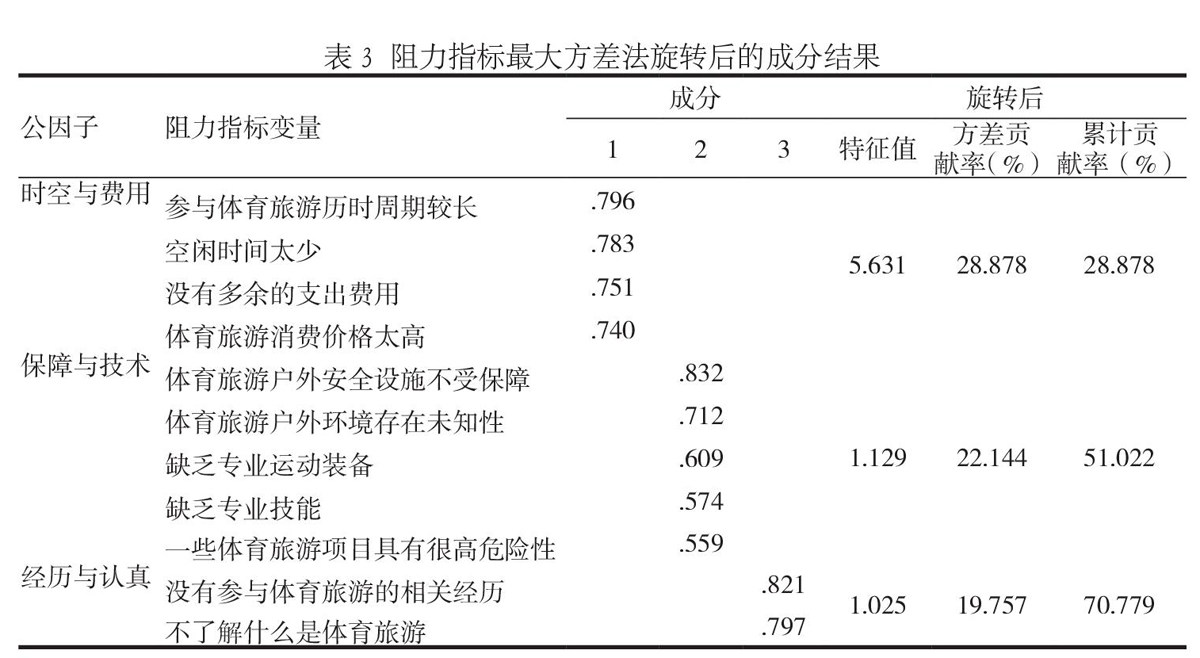 其次,对参与民族体育旅游的拉力动机指标进行因子分析,在因子分析时,进行KMO检验和巴特利特球体检验来判断这些多变量间是否存在共性。KMO值=0.833,远大于0.5比较适合做因子分析。同时巴特利特球体检验的值为.000,远低于显著水平的0.05,说明这些数据不是单位阵,具有相关性可以用因子分析。针对11项阻力因素以特征大于1,因子载荷大于0.4为标准,进行因子分析。从旋转后的成分结果,见表3,在11个指标中提取了三个因子包含了原始数据中的70.704%的信息。其旋转后的特征值为1.025、1.129和5.631.其累计方差贡献率为70.779%.就其信息对这3个公因子进行了命名,公因子1在民族体育旅游历时周期较长、空闲时间太少、没有多余的支出费用、民族体育旅游消费价格太高等方面有很高的因子载荷,累计贡献率为40.154%。因此,将它命名为“时空与费用”;公因子2的方差贡献率为22.144%,它包含了安全设施不受保障、民族体育旅游户外环境存在未知性、缺乏专业运动装备和技能,于是把它命名为“保障与技术”。公因子3包含了没有参与民族体育旅游的相关经历、不了解什么是体育旅游。所以将它命名为“经历与认知”。