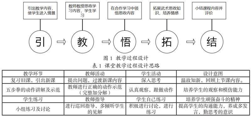 依据学情分析,本课程的目标为:通过回顾上节课的内容,强化动作标准,培养学生温故知新的意识;在学习五步拳技术动作的实践过程中培养学生顽强奋斗、自强拼搏、坚持不懈的精神;通过组队学习培养学生团结协作和主动学习、不断创新的能力;通过五步拳文化内涵的学习,激发学生对传统武术的兴趣,培养学生的民族自豪感、文化自信和爱国主义精神。