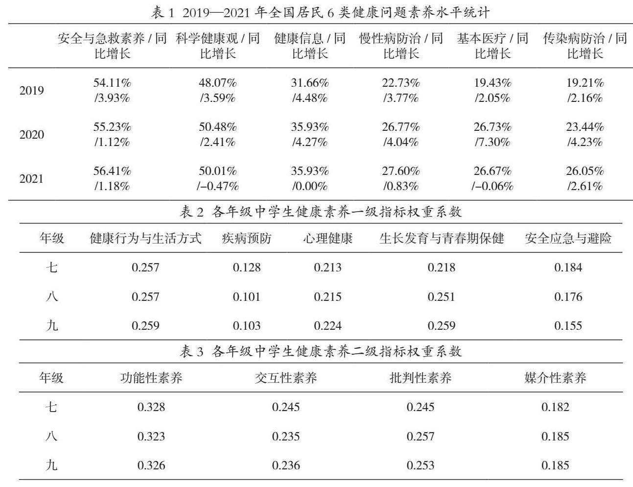 2.中学生。全中国的中学分为初级中学与高级中学(普遍简称初中和高中),两者同属于中等教育的范围。初级中学,简称“初中”。初中是中学的初级阶段,初中一般是指九年义务教育阶段,是向高中过渡的一个过程。我国的高中阶段教育包括普通高级中学、普通中等专业学校、成人高中、职业高中、中级技工学校、职业中等专业学校、中等师范学校等,高中阶段的学生年龄一般都在15周岁以上。在历年全国健康素养监测时,其监测对象为15—69岁的城乡居民。可见,高中阶段的学生都在全国健康素养监测的年龄范围内,也就是说,国家认定现行的中国公民健康素养调查问卷是适合高中阶段的学生使用的。因此,本研究重点关注中学生里初中学生的健康素养问题,即探讨初中七年级、八年级和九年级学生的健康素养评价指标的权重问题。