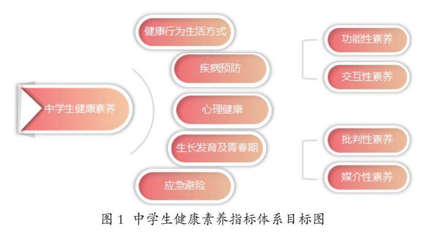 依据《中国公民健康素养——基本知识与技能(试行)》,将健康素养划分为三个方面,即基本健康知识和理念素养、健康生活方式与行为素养、基本技能素养。以公共卫生问题为导向,将健康素养划分为六类健康问题素养,即科学健康观素养、传染病防治素养、慢性病防治素养、安全与急救素养、基本医疗素养和健康信息素养。中学生健康素养水平是学校体育工作重要内容。2008年12月教育部印发颁布《中小学健康教育指导纲要》,文件要求进一步加强学校健康教育工作,培养中学生的健康意识与公共卫生意识,掌握健康知识和技能,促进学生养成健康的行为和生活方式。中学生身心发展特点主要在于,身体上体态骤变、机能增强、身体素质提高、性发育成熟;而认知能力、情感、意志、人生观、价值观、道德品质等心理方面存在顺序性和阶段性、稳定性和可变性、共同性和差异性等规律。据此,把中学健康教育内容分为五个领域:健康行为与生活方式、疾病预防、心理健康、生长发育与青春期保健、安全应急与避险(图1),每个一级指标下的二级指标相同,为功能性素养、交互性素养、批判性素养、媒介性素养四个维度[2]。