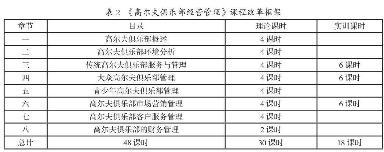 《高尔夫俱乐部经营管理》这门课程,市场需求作为导向,结合岗位需求,对其课程内容框架和实训进行改革,其重点是当前高尔夫俱乐部面临着内外部环境发生重大变化,分析俱乐部的微观与宏观环境;高尔夫俱乐部在经营管理中存在的问题与解决方法;传统高尔夫俱乐部其重要部门运营;目前高尔夫面临着大洗牌,新型高尔夫室内俱乐部开始兴起,这类俱乐部有何优势,室内高尔夫如何服务与管理、营销管理、维护客户关系。