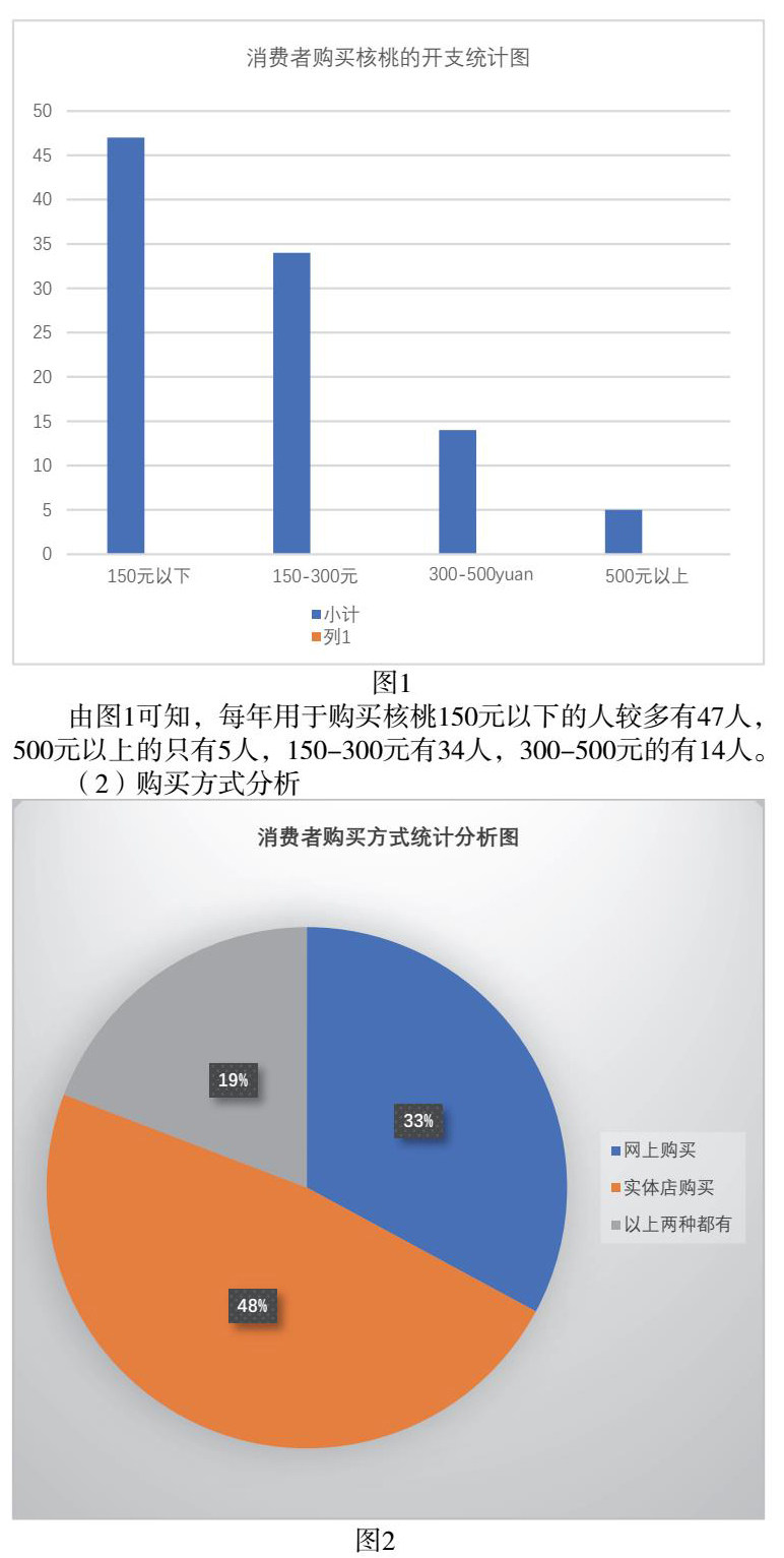 由图1可知,每年用于购买核桃150元以下的人较多有47人,500元以上的只有5人,150-300元有34人,300-500元的有14人。