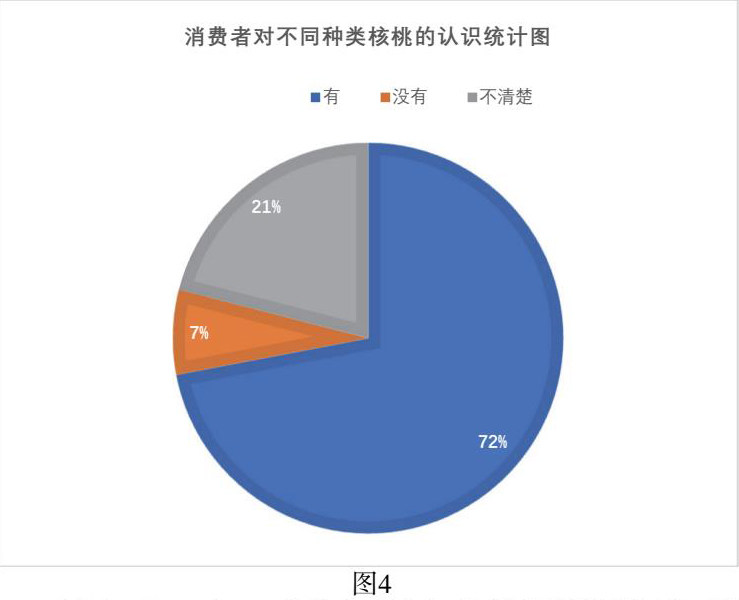 由图4可知,有72%的消费者认为不同类别的核桃是有区别的,21%的消费者不了解核桃的种类和区别,7%的人认为核桃没有区别。由此分析可知,大部分的消费者认为核桃种类还是有不同的,我们在做产品时,应该考虑不同种类的核桃,对消费者的影响,或者说消费者喜欢什么种类的核桃。并且49%的消费者偶尔会购买与核桃相关的产品,32%的人会购买与核桃相关的产品,有18%的人一般不会购买与核桃相关的产品,有1%的人不会购买与核桃相关的产品。总体来看大多数人还是会愿意购买与核桃相关的产品,我们应该加大宣传,把潜在消费者变为直接购买者。