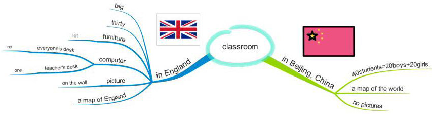 以外研版七年级上册第三模块Unit 1 There are thirty students in my class.的教学为例,文本以谈论中英两国教室基本情况为主题。在完成教学导入、课本听力任务之后,教师可以和学生一起理清对话的大概思路和重要内容,结合文本,共同绘制思维导图如下: