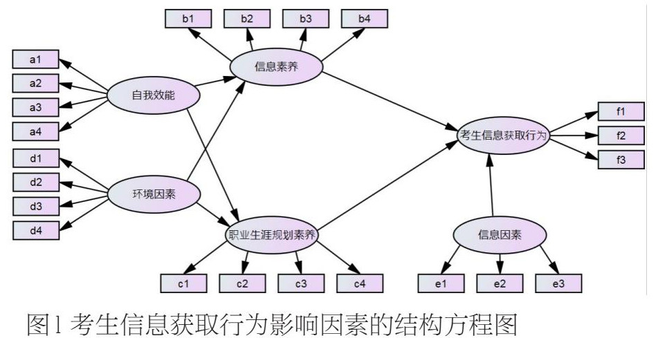 依据结构方程模型原理,本文构建如图1所示的影响考生信息获取行为的结构方程模型。