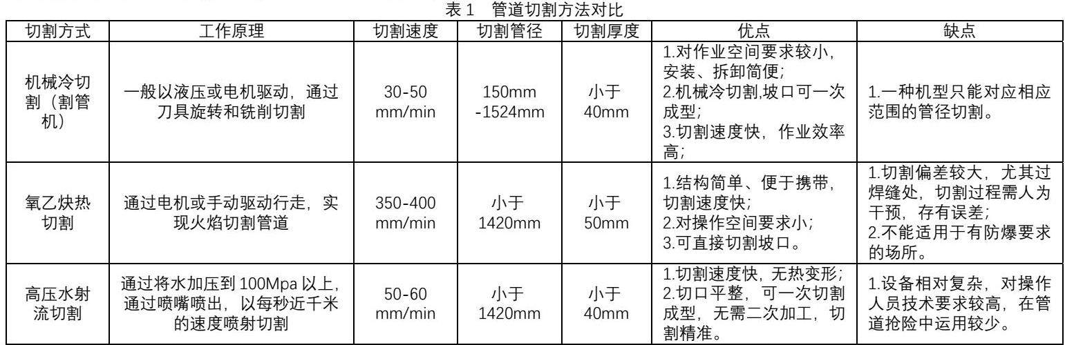 在管道切割作业中,切割方法主要有机械切割、热切割、高压水射流切割等方法,工作原理、切割效率均有所不同,下面对各种切割方法进行对比。见表1。