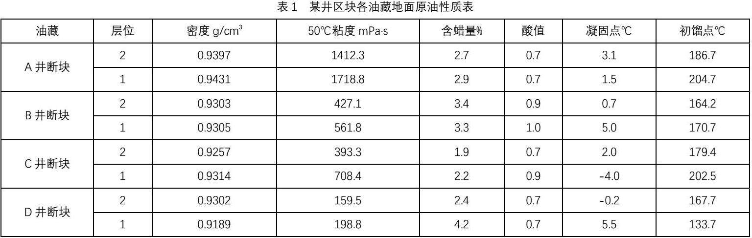 C井2断块油藏地面原油密度平均0.9257g/cm3,50℃粘度平均393.3mPa·s,平均含蜡量1.9%,原油凝固点平均2.0℃。C井1断块油藏地面原油密度平均0.9314g/cm3,50℃粘度平均708.4mPa·s,平均含蜡量2.2%,原油凝固点平均-4.0℃。