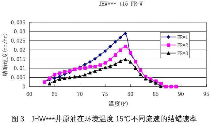 JHW***井原油:图3表示了恒定管外温度为15℃,流量分别控制在1L/min、2L/min、3L/min时的结蜡速率Wr(mm/hr)随油温变化的实验曲线。