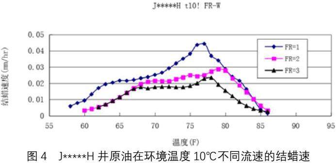J*****H井原油:环境温度分别是10、15℃时,流速分别为1、2、3升/分的结蜡速率曲线绘于图 5和图6中,J*****H井原油的管流中心温度在26℃(79F)时,出现结蜡高峰。与JHW***井原油一样,在油温进一步的下降时 ,结蜡速率有所下降。随着流速的增加,结蜡速率变小。