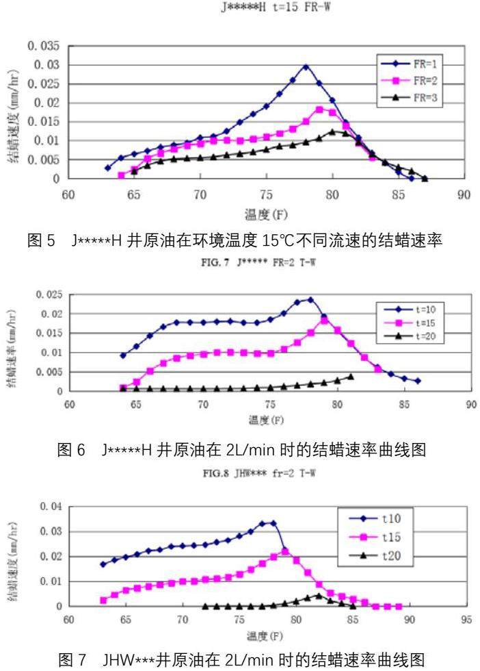 J*****H井原油:图6是流速为2升/分时不同管外环境温度(10、15、20℃)结蜡速率曲线图。