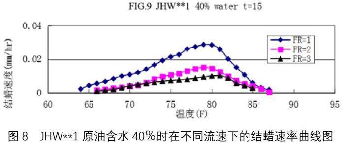 JHW**1原油含水40%在不同流速下的结蜡速率曲线绘制于图8中,由图可以看出:含水时流速对结蜡速率的影响与不含水原油的实验结果是一样的,流速小时结蜡的速率大,流速大时结蜡的速率小。这是由于流动所产生的对管壁冲刷作用所致。