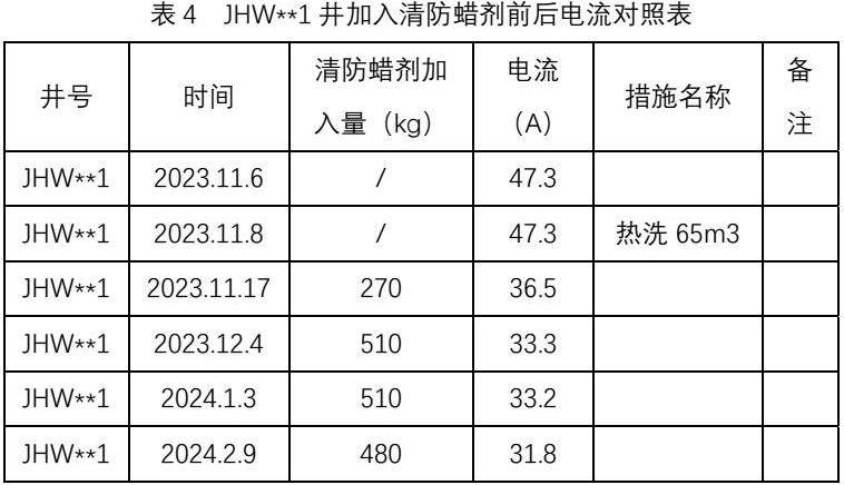 根据室内实验评价结果选取60井次进行现场应用,该区块为螺杆泵井,根据加入清防蜡剂前后螺杆泵电流变化判断应用效果,以1井次为例: