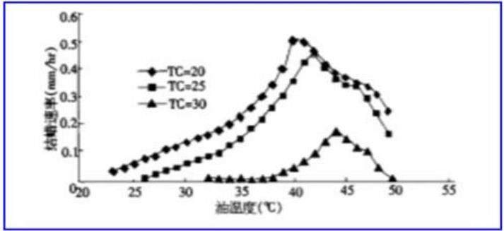由图可以看出不同流速下,管外环境温度对结蜡速率影响的规律是一致的,管外环境的温度越低,结蜡的速率将越高,在同一油温度下几乎是正比的关系。当管外环境温度高到接近原油的析蜡点温度时,结蜡的速率就最低。