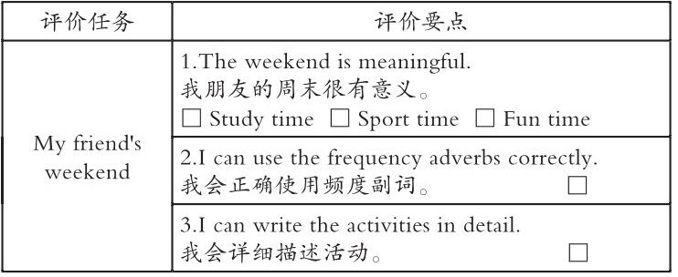 “在主题引领的复习课中,教师本着整体性、系统性的理念梳理内容主题,并以情境化的话题推进课堂复习,引导学生在真实语用中突破难点”(李孝燕,2020)。作为本单元的第四课时,在单元整体主题与情境的引导下,需要发挥高效的总结作用。在完成“Our Weekends”我和我朋友的周末的写作任务时,充分串联了前两课时中对周末活动的对话操练以及第三课时中对“My weekends”我的周末的写作练笔,将同一主题下的若干内容进行整合,在评价任务的指导下,先呈现已经完成的“我的周末活动”的段落,在此基础上完成“我朋友的周末活动”,如此一来,学生在课上能轻松完成一篇完整的写作报告。