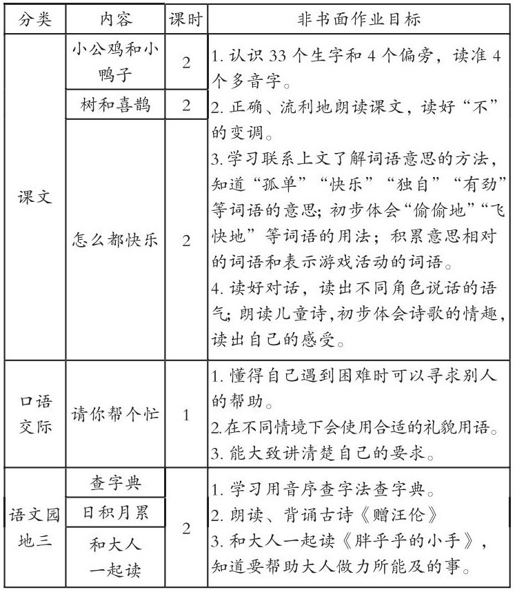本单元围绕“伙伴”个主题,安排了三篇课文《小公鸡和小鸭子》《树和喜鹊》《怎么都快乐》。本组课文从不同角度表达了伙伴之间的情谊——互帮互助、快乐合作、友好相处。本单元还安排了“口语交际:请你帮个忙”“语文园地三”,包括“查字典”“日积月累”“和大人一起读”几个部分,贴合学生的生活化,又能锻炼学生的综合能力。结合义务教育语文课程标准(2022年版)中对第一学段有明确要求,在遵循课标的要求下,明确本单元的非书面作业目标。