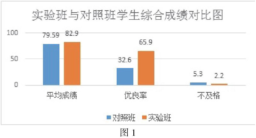 期末2个班的综合成绩与对照班对比的结果如图1所示,学生的平均成绩有所提升,优良率有较大的提高,消除了两极分化的情况,不及格率相对比较低。