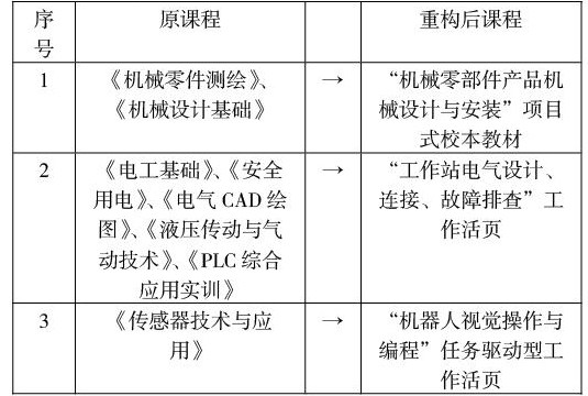 除此之外,通过对标技能大赛来促进一体化教学模式的构建,可行且有效。世赛项目先进的理念、严格规范的技术标准、严谨的比赛规则、规范的工作流程,代表着当今世界职业技能领域发展的先进水平和技术趋势。以世赛项目机器人系统集成为例,以相互合作的两人为一组,从赛事任务书开始,每天完成不同的比赛任务,需要两名选手从电气、机械设计到安装,从机器人离线编程到实际操作,从PLC软件编程到通讯,从相关文件编写到演讲展示,完美展示了一体化教学的最终效果。笔者通过世赛项目,将课程内容与世赛每个模块之间对现有的工业机器人课程体系进行部分重构,结果如下: