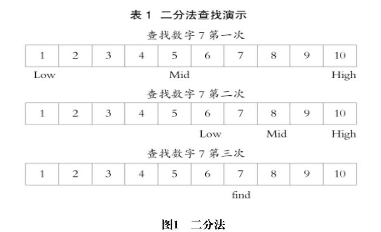 从概念维度上看,算法的概念最初诞生于数学领域,指解决问题的一般方法和步骤。在现代的概念定义中,将算法这一概念定位为:在有限步骤内,以明确、精简的操作方法解决一类问题的方法。从概念定义变化中可以看出算法思维的共性体现在解决问题的思想性上。算法思维在心理学、哲学与逻辑学等领域都具有不同的定义。在计算机科学领域,算法思维所涉及的内容较为广泛,统一的表现为:解决问题的高效方法和思维模式。如,在1-10的数字中查找某一特定数字,直接进行查找明显效率低下,而通过二分法的方式,可以在每次数字查找的过程中缩小范围,从而提高问题解决的效率。如图1所示。在二分法的方式中,可以将7次查找次数优化成3次。随着数字规模越大,二分法的数字查找模式更具有优势。在查找数字的这一过程中,算法思维影响到解决问题的整体效率。