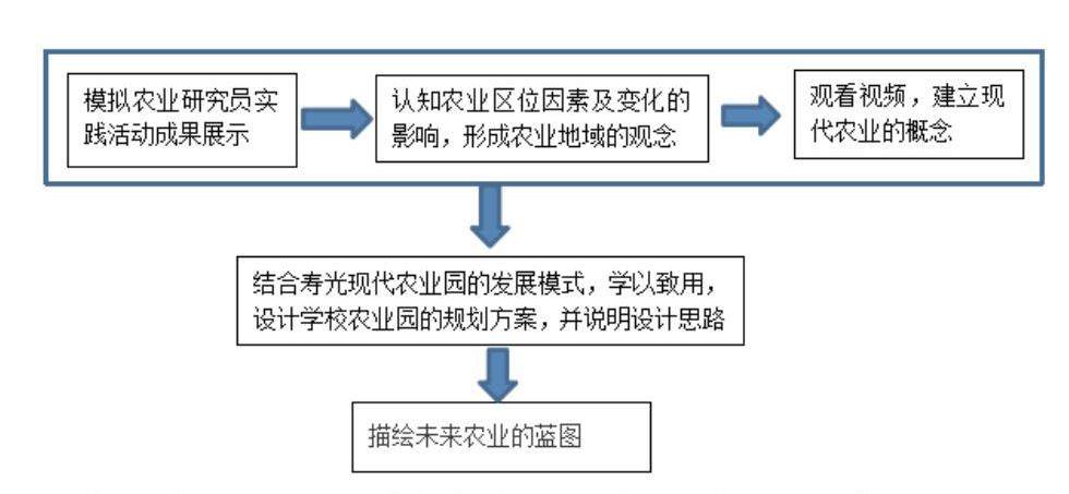 本节课是在学生模拟农业研究员进行农业社会实践调查后,通过对社会调研结果进行分析,达成课标要求,实现充分认知农业区位因素及变化的影响,形成农业地域的观念。然后结合寿光现代农业园的发展模式,学以致用,设计学校农业园的规划方案,建立现代农业的概念,并描绘未来农业的蓝图。如下图展示: