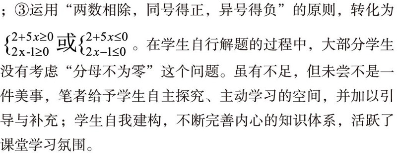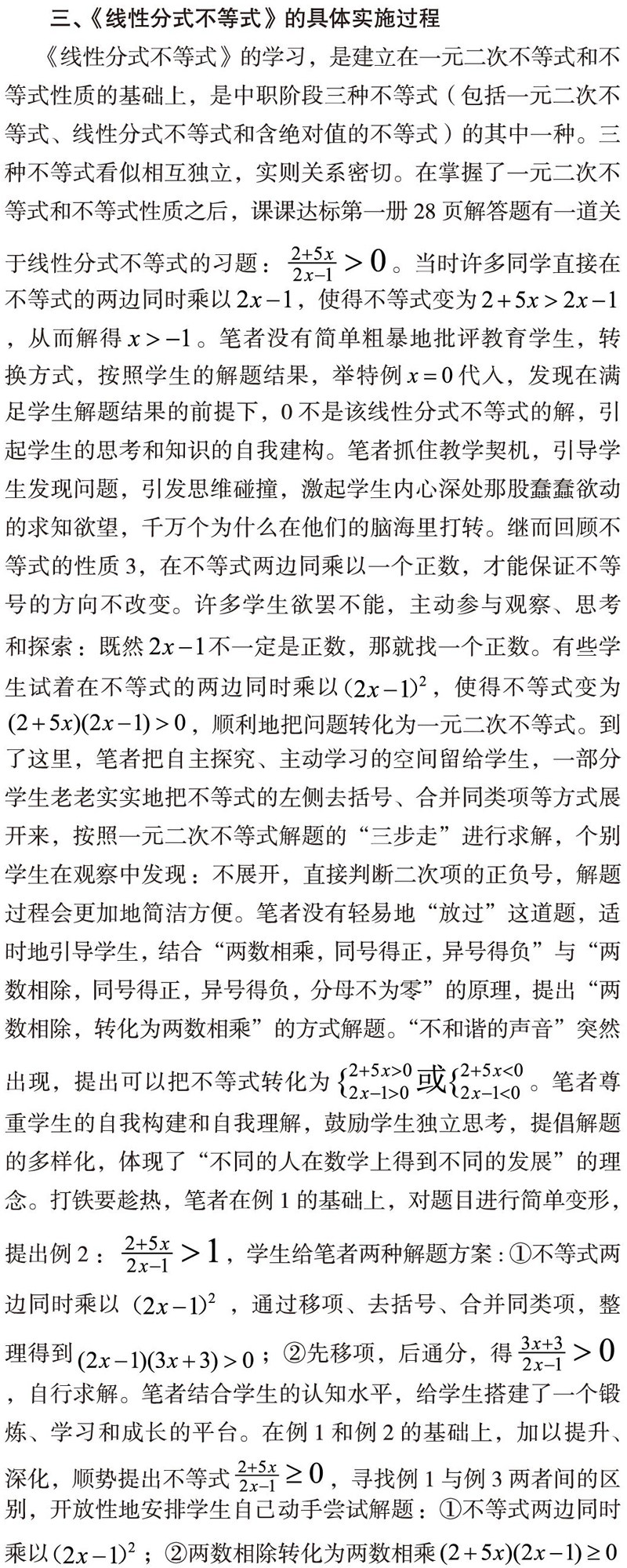 《线性分式不等式》的学习,是建立在一元二次不等式和不等式性质的基础上,是中职阶段三种不等式(包括一元二次不等式、线性分式不等式和含绝对值的不等式)的其中一种。三种不等式看似相互独立,实则关系密切。在掌握了一元二次不等式和不等式性质之后,课课达标第一册28页解答题有一道关于线性分式不等式的习题:。当时许多同学直接在不等式的两边同时乘以,使得不等式变为,从而解得。笔者没有简单粗暴地批评教育学生,转换方式,按照学生的解题结果,举特例代入,发现在满足学生解题结果的前提下,0不是该线性分式不等式的解,引起学生的思考和知识的自我建构。笔者抓住教学契机,引导学生发现问题,引发思维碰撞,激起学生内心深处那股蠢蠢欲动的求知欲望,千万个为什么在他们的脑海里打转。继而回顾不等式的性质3,在不等式两边同乘以一个正数,才能保证不等号的方向不改变。许多学生欲罢不能,主动参与观察、思考和探索:既然不一定是正数,那就找一个正数。有些学生试着在不等式的两边同时乘以,使得不等式变为,顺利地把问题转化为一元二次不等式。到了这里,笔者把自主探究、主动学习的空间留给学生,一部分学生老老实实地把不等式的左侧去括号、合并同类项等方式展开来,按照一元二次不等式解题的“三步走”进行求解,个别学生在观察中发现:不展开,直接判断二次项的正负号,解题过程会更加地简洁方便。笔者没有轻易地“放过”这道题,适时地引导学生,结合“两数相乘,同号得正,异号得负”与“两数相除,同号得正,异号得负,分母不为零”的原理,提出“两数相除,转化为两数相乘”的方式解题。“不和谐的声音”突然出现,提出可以把不等式转化为。笔者尊重学生的自我构建和自我理解,鼓励学生独立思考,提倡解题的多样化,体现了“不同的人在数学上得到不同的发展”的理念。打铁要趁热,笔者在例1的基础上,对题目进行简单变形,提出例2:,学生给笔者两种解题方案:①不等式两边同时乘以,通过移项、去括号、合并同类项,整理得到;②先移项,后通分,得,自行求解。笔者结合学生的认知水平,给学生搭建了一个锻炼、学习和成长的平台。在例1和例2的基础上,加以提升、深化,顺势提出不等式,寻找例1与例3两者间的区别,开放性地安排学生自己动手尝试解题:①不等式两边同时乘以;②两数相除转化为两数相乘;③运用“两数相除,同号得正,异号得负”的原则,转化为。在学生自行解题的过程中,大部分学生没有考虑“分母不为零”这个问题。虽有不足,但未尝不是一件美事,笔者给予学生自主探究、主动学习的空间,并加以引导与补充;学生自我建构,不断完善内心的知识体系,活跃了课堂学习氛围。