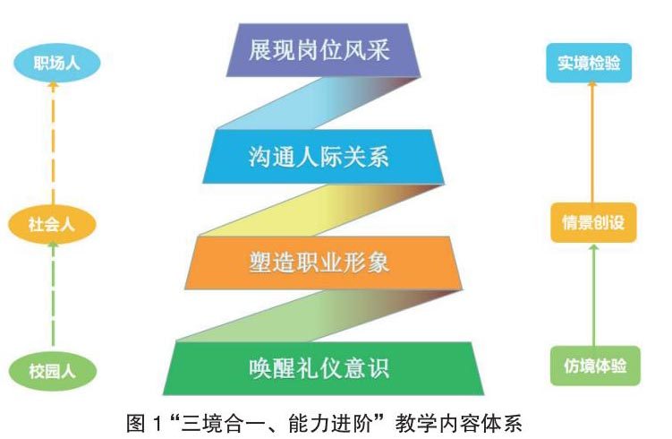 以旅游管理专业群通用课程“文旅人际沟通与礼仪”课程为例,构建“三境合一,能力递进”的课程教学内容体系。遵循学生认知规律和能力形成规律,以从个人和职业发展为路径,设计从简单到复杂的学习情境,重构课程教内容体系,包括了唤醒礼仪意识、塑造职业形象(仪容、仪表、仪态礼仪)、沟通人际关系(见面、社交、沟通礼仪)、展现岗位风采(酒店、旅行社、旅游景区服务礼仪),逐步式递进,螺旋式上升。根据学生认知和能力形成规律,实施因材施教,通过仿境体验(思考价值、获取知识、了解技能)、情景创设(感悟价值、巩固知识、掌握技能)、实境检验(认同价值、拓展知识、应用技能),应用能力逐级提升,突出课程的职业性、实践性和开放性。