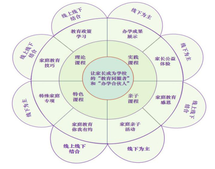 3.家长学校课程体系建设全渗透。课程体系建设是办好家长学校的重要内容和关键环节。中小学学校要进一步摸索、整合和梳理,构建思政家校协作八大课程体系:以宣传各级各类方针政策为主教育政策宣讲课程,以提升家长家庭教育能为为主的家庭教育专题课程,以推介学校优秀办学成果和获得家长支持配合为主的学校办学特色课程,以关爱特殊学生群体和家庭为主的特殊家庭专项课程,以构建和谐亲子关系为主的校内校外亲子课程,以学校免费为家长提供的家长自学为主的家庭教育自学课程,以家长参与学校管理为主的家长体验公益课程和以学生感恩父母为主的家庭教育感恩课程等。