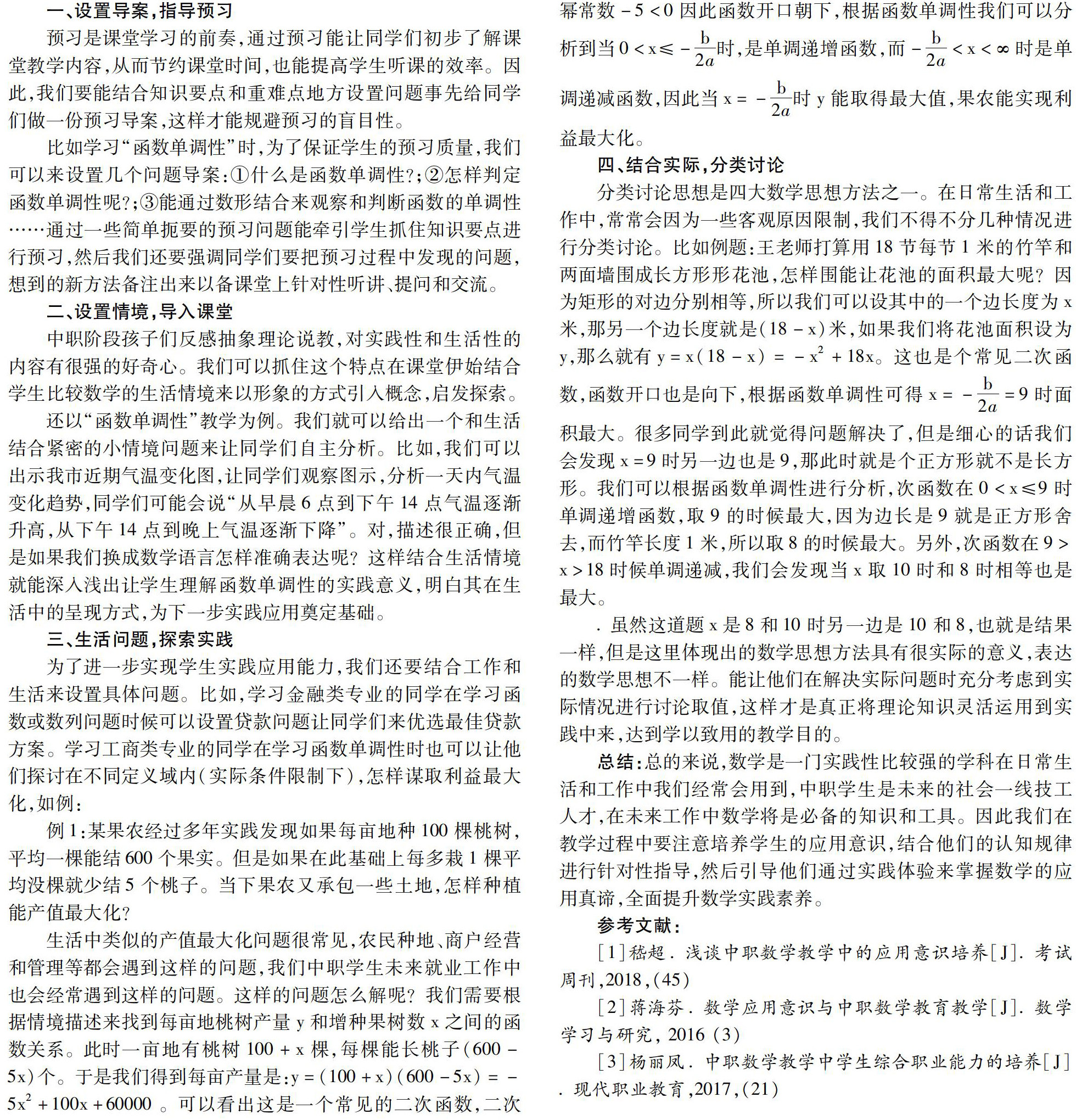 1.嵇超.浅谈中职数学教学中的应用意识培养[J].考试周刊,2018,(45)