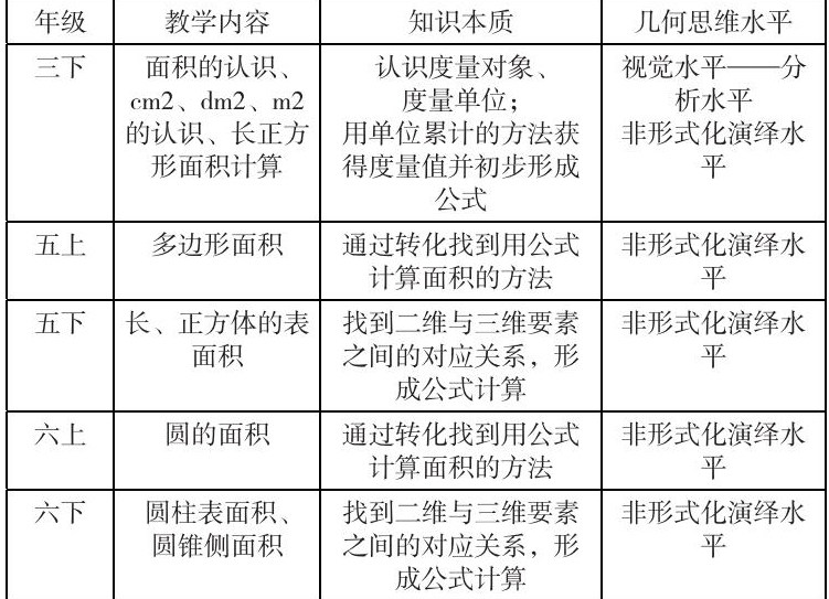 结合前面对小学生“图形面积”的思维水平的划分及教学内容、度量本质的分析,学生在各年级应达到的思维水平分析如下:观察上表不难发现:在第一学段的学习中,学生的思维重点是从视觉水平向分析水平的发展;第二学段是以视觉水平为基础,经历分析水平,并最终达到非形式化演绎水平。学生的整体思维水平的发展符合范希尔的几何思维水平发展理论。