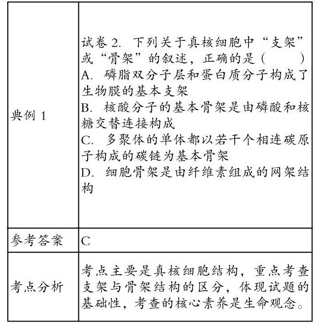 此题答案选项为C,学生错误率极高,很多成绩好的同学难以置信自己会犯错。学生在讲解时直接将课本中的概念原话截图圈出,很多学生恍然大悟,原来在于对核酸基本骨架、细胞骨架、多聚体等基本概念的辨析还存在误区。通过翻开课本找答案设计意图在于培养学生重基础、回归教材的解题习惯。在学生完成通过提问:1.生物大分子多糖、蛋白质、核酸的单体是什么?脂质属不属于生物大分子?2.原核生物有细胞骨架吗?细胞骨架存在于哪里?3.蛋白质的结构是由什么决定的?DNA的结构由什么决定?两者什么不同?让学生能够在课后把对应知识点常考误区分辨清楚。