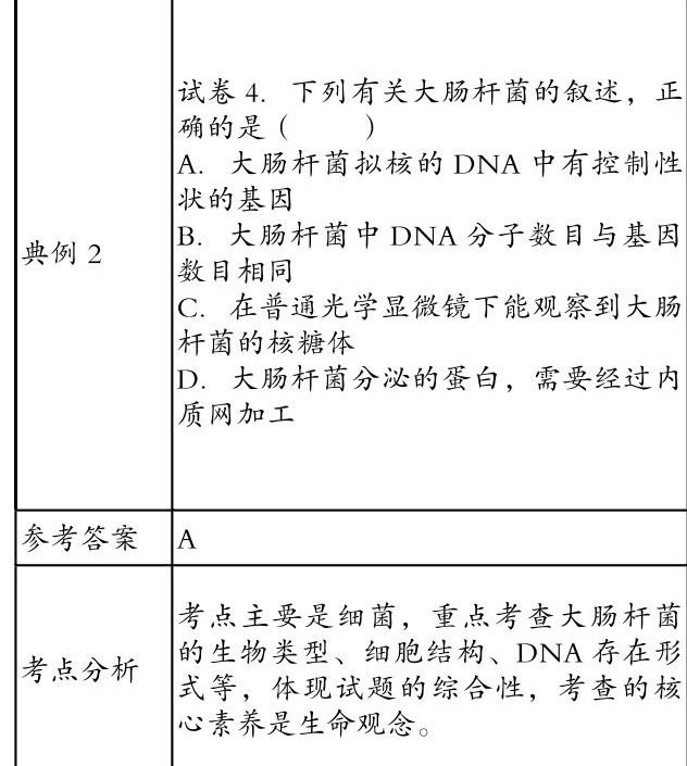 此题答案选项为A,笔者让所教学生A同学,运用表格比较的方式上去为学生回顾梳理比较原核细胞与真核细胞的7个常考知识点的区别。A同学一开始不知道从何入手,在慢慢引导其列表格进行横纵向比较后,他的知识体系逐步得到完善丰富,后面在课堂上能够独立地进行讲解,且知识输出十分流畅,获得很好的效果。