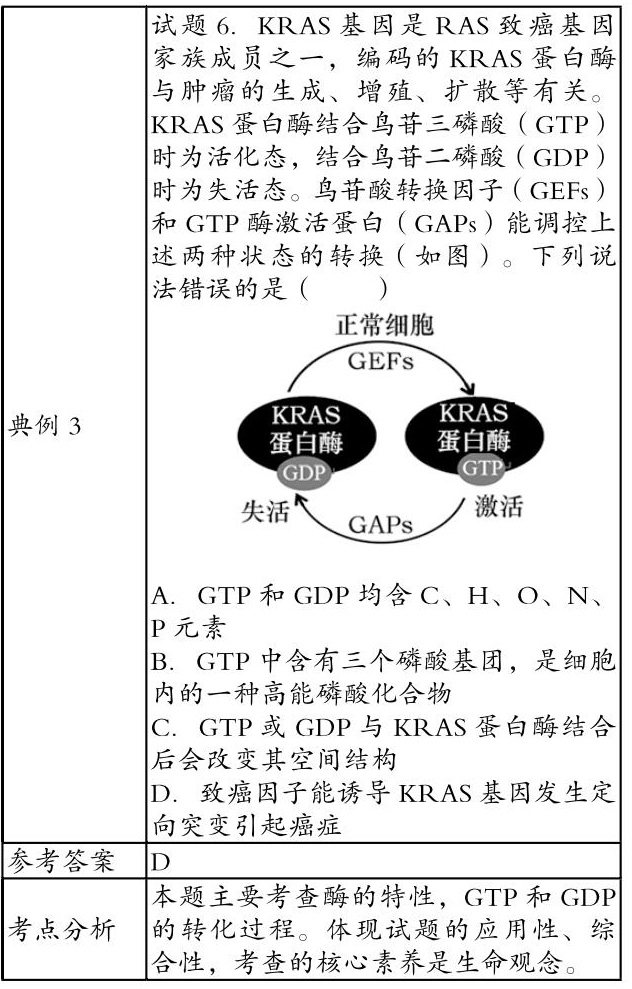 典例3 试题6.KRAS基因是RAS致癌基因家族成员之一,编码的KRAS蛋白酶与肿瘤的生成、增殖、扩散等有关。KRAS蛋白酶结合鸟苷三磷酸(GTP)时为活化态,结合鸟苷二磷酸(GDP)时为失活态。鸟苷酸转换因子(GEFs)和GTP酶激活蛋白(GAPs)能调控上述两种状态的转换(如图)。下列说法错误的是( )