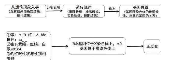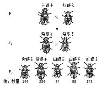 以下两对基因与果蝇眼色有关。眼色色素产生必需有显性基因A,aa时眼色白色;B存在时眼色为紫色,bb时眼色为红色。2个纯系果蝇杂交结果如下图,请据图回答下问题。