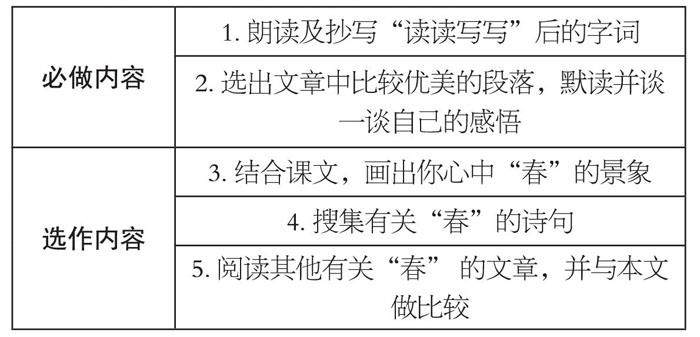 教师在设计层次性作业时,可以结合学生日常课堂表现、学习成绩、学生个人喜好等,以学生比较感兴趣的方式,划分为“黄金”“钻石”“王者”三个层次,每层作业内容、作业量有所不同,学生可以按照自己的等级来完成相对应的作业。每周一评,教师按照学生本周完成作业情况,可以降级或升级。例如,学生在学习《春》这一课后,教师设计出以下作业表格。