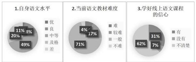 学习信心方面,根据学生自身语文水平自评、当前语文教材难度调查、学好线上语文课程的信心等方面设置了三道选择题。结果显示,49%的学生认为自身语文水平属于中等,11%的学生认为自身语文水平很低;71%的学生认为当前语文教材的难度一般,8%的学生认为教材偏难;31%的学生有信心学好线上语文课程,62%学生选择不清楚,不知道线上学习内容是选择该选项的主要原因。具体如下图: