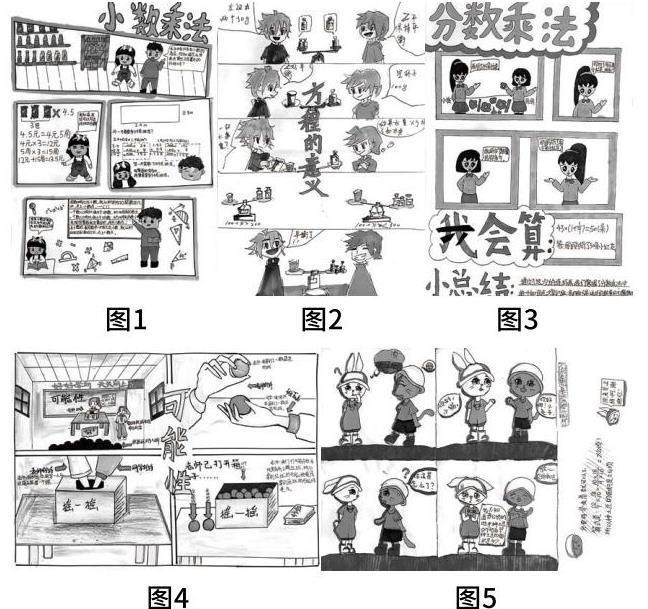 学校教师可以在每学期的校园阅读节期间安排数学阅读展示活动,为小学生提供展示自我阅读成果的平台,如“数学阅读连环画”“数学阅读手抄报”等,同学们可以在其他同学的作品中找到数学阅读的乐趣。如下图1,学生运用“小数乘法”的知识描绘生活中购买物品的情境。图2中,学生运用“方程的意义”的知识描绘两个小朋友通过利用天平和砝码测量物体重量的情境。图3中,学生利用“分数乘法”中“一个数比另一个数多多少”的知识描绘两个小女孩比较所折花朵的数量的情境。图4中,学生利用“可能性”的知识描绘在课堂中教师和学生摸球的情境。图5中,学生利用“分数乘法”的知识描绘小兔和小猫求土豆地面积的情境。学生绘制的连环画漂亮有趣,其他学生也很有兴趣一起阅读分析情境中的问题。