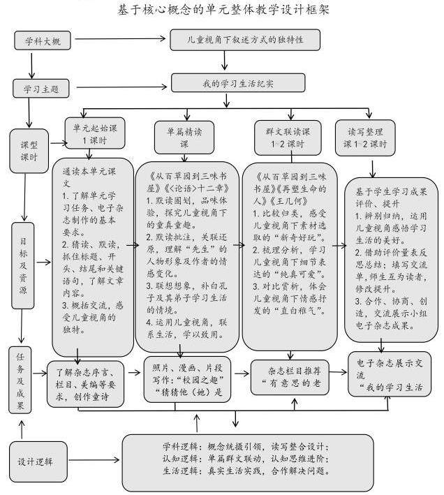 基于课标、教材、单元的内容及要求,提取本单元的大概念为:“儿童视角下叙述方式的独特性”,在追问“什么是儿童视角”的过程中,将大概念分解为3个学生需要理解、学习并运用的小概念:“儿童视角下素材选取的‘新奇有趣’、儿童视角下细节表达的‘纯真可爱’、儿童视角下情感抒发的‘直白稚气’。”并围绕大概念整体设计本单元的素养目标、课时、情境、任务、资源等。