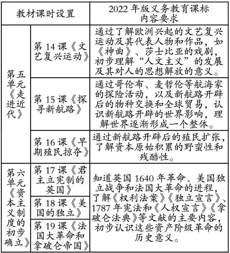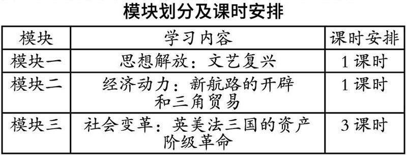 因此,从课标出发,笔者将确定本单元的整体教学目标为:1.借助时间轴梳理文艺复兴运动、新航路的开辟、三角贸易、英美法三国资产阶级革命发展的过程中的大事件,认识17到19世纪资本主义制度在英美法三国的确立。2.通过了解文艺复兴运动及其代表人物和作品,初步理解人文主义的发展及其思想解放作用,认识文艺复兴对资本主义的产生奠定思想基础。通过新航路开辟后的殖民扩张和全球贸易,认识新航路的开辟和早期殖民掠夺加速了欧洲资本主义的原始积累,为资本主义的发展奠定经济基础。3.通过横向比较欧美资产阶级革命从背景到过程再到结果的异同,初步探究资本主义制度在实践中的多样性。初步认识这些资产阶级革命的历史意义及历史发展趋势。借助法律文件条款,初步理解英美法三国政治体制的进步性和局限性。