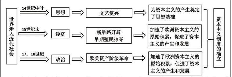 综合上述内容梳理我们可知,这两个单元各课是从思想、经济、政治等三个方面对资本主义的产生进行历史解释,按照传统课时学习,学生难以从宏观上把握本单元的主旨思想。因此,可以利用大概念学习对单元进行重构,突破教材单元的限制,确立大单元教学的主题为:资本主义制度的确立。