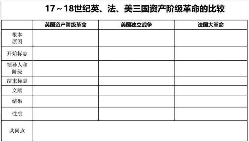 1.在表格归纳比较英美法资产阶级革命概况的基础上,分析三国资产阶级革命的共同点和不同点。由此你得到哪些认识?
