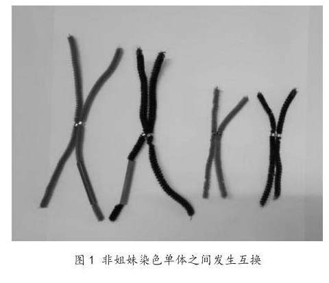本课需要用到的模型材料主要有两种颜色的扭扭棒、磁环(外径6mm,厚度3mm,孔内径3mm),与扭扭棒颜色相同的短吸管等。将短吸管穿过另一种颜色的扭扭棒,模拟非姐妹染色单体之间的互换(见图1)。短吸管的使用,使扭扭棒无需通过裁剪和拧来模拟互换的过程,保证材料的完整性和可重复性;且可以随意调整吸管所在位置,让学生知道互换的片段不一定是染色体的末端。让学生对非姐妹染色单体间的互换有更清晰、全面的了解。
