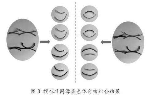 根据学生补充的减数分裂图像,请学生找出配子的染色体组合有哪些。通过图像的对比,学生可以得出配子的染色体组合总共有4种(见图3)。(下转第19版) (上接第18版)教师继续拿出第三对同源染色体,引导学生思考分析,若体细胞中含有三对同源染色体,则配子的染色体组合有8种。通过设问,逐步递进,引导学生在活动中演绎和推理,思考染色体组合并进行归纳,得出一个个体在不考虑互换的情况下,配子染色体组合有2n种,培养学生分析问题和解决问题的能力,发展科学思维。