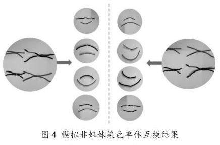 在得出不考虑互换情况下的配子染色体组合后,教师提出新问题:若四分体的非姐妹染色单体之间发生互换,配子中的染色体组合又有哪些?学生利用扭扭棒及短吸管再次进行模拟,当体细胞中含有一、二、三对同源染色体时,配子染色体组合分别有4、8、16种,此时,教师需要强调互换的发生仅是可能,概率并无定数,因此不能简单总结为2n+1种。互换的发生,增加了染色体组合的种类(见图4)。最后,教师引导学生归纳配子中染色体组合多样性的原因。