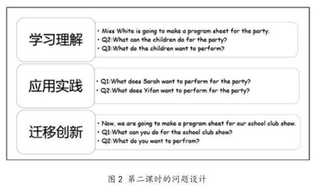 以本单元第二课时为例,基于课时教学目标,按照英语学习活动观的学习理解、应用实践、迁移创新三个活动层级,笔者设计了层层递进的问题链,推动学生主动参与、探究任务的完成,构建知识结构。